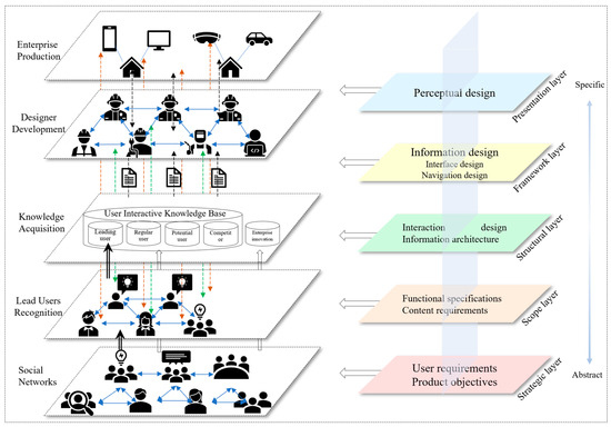 The interactive innovation product development in the context of mobile Internet is summarized in Figure 4, which consists of the following five layers. Firstly, there is the social network layer, where the mobile Internet provides a platform for enterprises to interact with users for innovation purposes. Users at different levels, including lead users, ordinary users, competing users, potential users, as well as suppliers and distributors, are invited or spontaneously join the product community to engage in interaction and communication. Through this platform, users can share product-related knowledge that can be used for product innovation. The communication includes discussions about product experiences, feedback on product issues, suggestions for product improvements, and so on. Secondly, there is the lead users’ identification layer. By leveraging the big data environment of the mobile Internet, user online psychology and behavior can be analyzed. This layer provides platform tools and data for observing users’ participation in innovation. By analyzing users’ participation in innovation at different levels, the system can identify lead users rapidly and accurately, facilitate efficient matching, and collect credit information. Enterprises can use this information to enhance interactive innovation with lead users. Additionally, through the structural observation and analysis of ordinary users’ consumption psychology and behavior, enterprises can make informed judgments about the consumption demand and direction of the ordinary user groups. Thirdly, there is the knowledge acquisition layer, which collects, recognizes, refines, and converts massive data obtained from different sources on the social network using big data technology. Furthermore, it identifies and establishes the user interactive knowledge base and enterprise innovation knowledge base based on the different interactive knowledge of lead users and ordinary users. Based on this knowledge base, enterprises, with the assistance of market analysts and mobile Internet big data technology, can extract product direction and market demand information. Fourthly, there is the designer development layer, where enterprise designers use the extracted information resources to support product innovation R&D. The designers understand the product direction and market demand information and communicate internally and interact with lead users to derive creative solutions for product innovation and develop and design new products. Finally, there is the enterprise production layer, where the enterprise department completes the production and processing tasks of product innovation and tests the products through the feedback and experience of lead users.