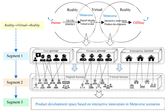 Although the Metaverse currently lacks a standardized definition, its characteristics have been widely recognized by researchers and professionals in the field. Roblox, for instance, initially proposed a set of eight key elements essential to the Metaverse, which include identity, social connections, immersion, low latency, diversity, accessibility, economic systems, and civilization [26]. Some researchers have also further defined the characteristics and properties of the Metaverse, encompassing social and spatial aspects, technological empowerment, co-creation between humans and AI, realism and reality mapping, as well as transaction and circulation [32]. Building upon existing research and the current state of Metaverse development [33,34], this paper highlights the following eight key features: virtual identity, strong social connectivity, three-dimensional (3D) immersive experiences, open content creation, digitization of human and social relationships, integration of the physical and digital worlds, stable economic systems, and the establishment of a civilized system. These features provide the necessary conditions for an interactive and innovative product development model, following a “reality → virtual → reality” framework. Specifically, virtual identity refers to users obtaining one or more digital identities within the Metaverse, corresponding to their real-life counterparts. Strong socialization is facilitated by the Metaverse’s built-in social network, which allows users to engage with others’ digital identities in a manner resembling real-life social interactions. The 3D immersive experiences are made possible by the support of virtual reality (VR) and other technologies, enhancing users’ sensory experiences within the Metaverse. The Metaverse is an open platform that facilitates the creation, expression, and interaction between users, fostering innovation and collaboration. It also supports a wide range of UGC and provides various means for expanding self-produced materials. In the digital era, the digitization of human and social relations predominantly occurs within the Metaverse. Here, the level of human–computer interaction surpasses or equals that of human–human interaction, effectively meeting the real needs of people. The integration of the physical and digital realms involves two primary aspects: the “digitization of the physical world” and the “actualization of the digital world”. In essence, the Metaverse first digitizes the physical world and subsequently utilizes the digital world to solve real-world problems. These two worlds complement each other, giving rise to the concept of “reality → virtual → reality”. The economic system within the Metaverse encompasses digital creation, digital assets, digital markets, digital currency, and digital consumption, and it gradually forms an economic framework that interrelates with the existing real-world economic system. Moreover, the Metaverse also entails the creation of a coherent civilization system where individuals can reside, form communities, establish cities, establish common regulations, and gradually evolve into a civilized society while ensuring survival.