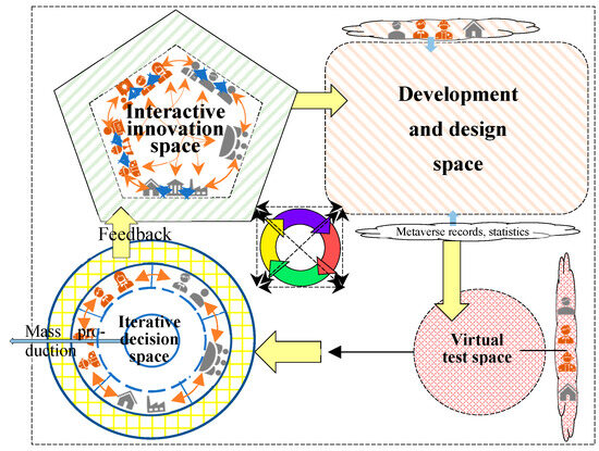 In addition to interacting with virtual avatars and digital identities in a virtual space to generate innovative knowledge, such as text, pictures, audio and video files, real-time images, ideas, behaviors, and more, users also incorporate offline information data into the Metaverse world [88,89,90]. This environment further enhances the advantages of a “reality → virtual → reality” creation model. In this model, individuals in the physical world enter the Metaverse world to develop and design new products via interaction and communication in the virtual space. These products are then manufactured on a small scale and, subsequently, mass produced in the offline physical world. This paper proposes a product development and design approach with interactive innovation within the Metaverse perspective, which is applicable to a wide range of products, particularly those that necessitate extensive R&D and involve high costs, such as automobile products. The framework is shown in Figure 5.