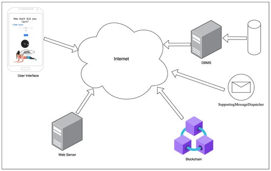 In the initial step, the user will utilize a browser to connect to the server that hosts the dApp. This connection provides a straightforward web interface, enabling interaction with both the system and the BC network. A database management system (DBMS) is included in the model to manage access to and modification of sensitive end-user data, such as personal data, that could uniquely identify the user. Additionally, the system includes support for the use of an open BC network. In particular, in this case, a pilot has been deployed using the Sepolia testnet []. This network, by its nature, is completely autonomous and is used for the anonymized recording of data related to user activities.