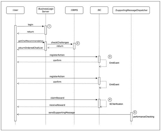 Figure 2 illustrates a typical interaction sequence within the system. As can be observed, the sequence begins with a user logging into the system via their dApp and interacting with the web server (checkpoint 1 in Figure 2). The users input their access credentials, and the server logs them into the system. Subsequently, in this prototype, the user must select the challenge to make use of the platform (see point 2 in Figure 2). In the following interaction, the user records the actions related to the Planking challenge on the BC network through the dApp (refer to point 3 in Figure 2). This action can be repeated multiple times. Each time, the smart contract responsible is invoked to perform a series of tasks, such as issuing the event on the network, recording the operation on the BC, and checking the status of the challenge. Point 4 illustrates the process carried out; if the conditions for the challenge’s success are met, a reward is issued. Finally, as depicted in point 5, the agent called “SupportingMessageDispatcher” is responsible for sending messages to users in order to promote user engagement, as described in Williamson et al. [].