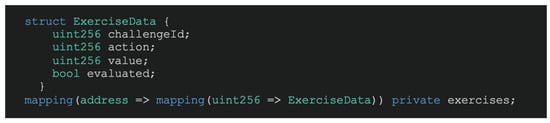 To carry out the actual storage of data on the decentralized data network that constitutes BC, it was necessary to define a unique structure (see Figure 4). This structure hosts information about the challenge itself, the action related to the former fulfilled, the user invoking the SC, and whether the action has already been rewarded or not.