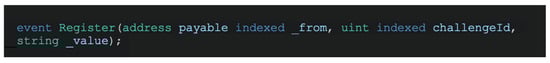 The invocation of the SC triggers several consequences. The first one is that an “event” is emitted on the network itself. This “event” (defined as shown in Figure 5) notifies all participants on the network that a certain user has performed a particular action within the framework of the challenge.