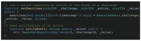 Within the framework of this platform, when it is appropriate to register the action associated with the challenge, the code shown in the following image (Figure 6) will be executed. This code stores in a secure manner the data with a proper timestamp and emits the event to let other participants know about this new piece of information.