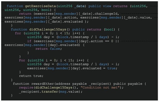 The reader can verify how the functions in Figure 7 check the completion of a plank in each of the last 15 days, as required for the Planking challenge. Additionally, the SC takes care of marking those actions that have already been awarded to avoid duplicate payments for a single action.