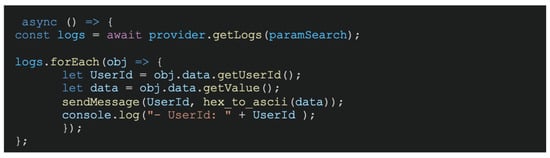 An independent agent in the system is used, which is responsible for these messages and carries out the dispatch of messages to the users automatically. To do this, it combines the information extracted from the events in the BC with existing information in DBMS of the system. Figure 8 shows an excerpt of the code that searches the BC records for relevant events and, after a superficial analysis, sends the data to the function that will carry out the final sending of emails to registered users using the information stored in the DBMS. Those users who do not have records on the network will also receive the corresponding email. This feature is external to the BC itself. Messages within the platform are sent to the user via channels external to BC, in particular, via email. This is a strategy to improve user engagement with the proposed solution using the gamification principles on several channels.