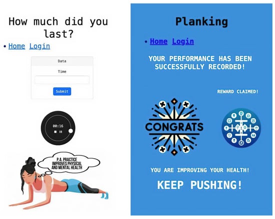 The Planking challenge used to verify the effectiveness of this prototype requires maintaining a proper abdominal plank position for a certain duration, replicating the posture of the “prone plank test”. This involves supporting the body’s weight on the toes and forearms while lying face down with a neutral pelvis position [,]. Users log into the proposed dApp, get into the described position, and, using the stopwatch provided in the interface, they control the duration of the exercise. The moment they lose this correct position, they stop the stopwatch, record the duration of the activity, and receive a confirmation message and motivation to continue taking part in the challenge. Rewards are presented to the user on two distinct occasions during the challenge: first, when they correctly perform an abdominal plank, and second, when they achieve the overall challenge, which requires performing the actions for 15 consecutive days. These rewards are distributed in the form of the platform’s tokens, which are backed by the BC. Figure 10 shows a user testing the application with the provided interface for this purpose with a stopwatch to control the duration of the exercise and the final motivation panel to continue with the practice of physical activity.