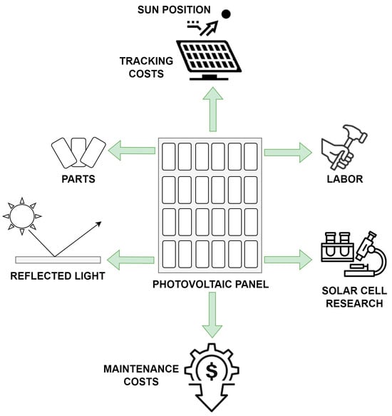 While current research seeks to discover new materials to improve solar cell efficiency, other studies are concerned with maximizing PV panel energy output [16,17,18,19]. One particular study determined the importance of angular efficiency in solar panels [20], showing that optimum positioning towards the Equator can increase annual power generation. Typically, PV panels are mounted at a predetermined angle appropriate for each season of the year, preventing the system from harvesting the maximum amount of solar energy available. To address this issue, several studies were conducted on the design and evaluation of single-axis [21,22,23,24,25] and dual-axis [26,27,28,29,30] solar tracking devices, showing the advantages of these systems compared to their static counterparts. In the majority of cases, a single-axis solar tracker can increase energy production by 20–25% when compared to a fixed-tilt PV panel [31], whereas a dual-axis tracker can typically provide an additional energy gain of 25–35% when compared to its static model [32], reaching a peak value of 45% in recent studies [26]. As illustrated in Figure 1, automated PV systems must support additional tracking costs, whereas maintenance costs can be lowered by employing proper testing methodologies, as will be detailed in the following sections of this manuscript.