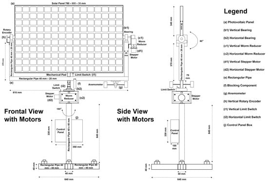 All of the abovementioned components, including the solar panel, frame, and both worm reducers, are supported by a rectangle bar 40 mm × 40 mm in size, which is installed on a metallic leg composed of two 640 mm bars welded perpendicularly to provide balance to the entire system. An anemometer (g) was mounted on the right side of the fork-shaped profile to measure the wind in real-time and trigger the flat position of the solar panel at 90-degree angles when turned by the vertical stepper motor for maximum safety. A rotary encoder (h) was installed on the left side of the bearing housing (b1) for proper monitoring.