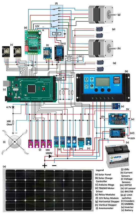 In the solar tracking device, additional sensors are primarily used to prevent damage to the electrical system and ensure the PV panel’s position is updated according to the photoresistor values. To avoid wire bottlenecks around the horizontal axis, mechanical endstop limit switches (MELSs) with version number SS-GL52 are installed for the stepper motors’ homing position and the maximum rotation angles of both axes. These four limit switches are connected to digital pins D22–D25 via 10 KOhm resistors. Due to the lack of feedback features in the stepper motors, two rotary encoders are connected to digital pins D8–D13 to monitor the rotation angle in real-time and detect any faults. Software testing validates the stepper motors, activating one of two LEDs (connected to digital pins D26–D27 via 350 Ohm resistors) to indicate motor damage. All hardware components, except the engine, receive a 5 V supply from a dedicated voltage inverter, which reduces 12 V from a car accumulator. An additional Bestep relay module measures the raw power generation of the PV panel under short-circuit conditions, protected by a 10 A, 1000 V diode against reverse voltage. The SIM800L V2 GSM/GPRS module transmits sensor data in real-time, monitoring temperature, wind speed, and solar radiation to aid in the software development of the dual-axis solar tracker.
