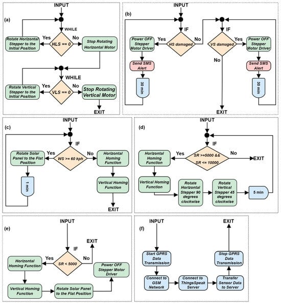 Workflow diagram custom functions used for automating the solar tracking system, comprising the (a) Homing Position Function, (b) Stepper Testing Function, (c) Wind Protection Function, (d) Solar Tracking Function, (e) Flat Position Function, and (f) Data Transfer Function.
