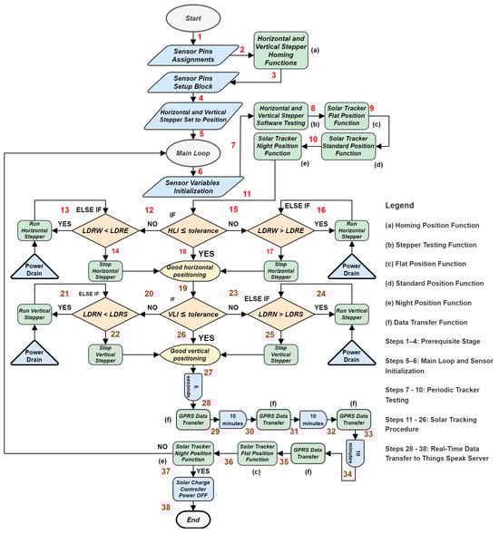 In the preparation stage, encompassing steps 1–4, all digital pins of the Arduino Mega2560 are assigned to the physical pins of the sensor modules. If the PV panel is in a random position, the horizontal and vertical stepper homing function block (a) will be triggered to bring both axes to their reference point. The software then verifies the functionality of all sensor modules and resets the steppers’ internal counters to the origin point (0,0). These initial steps are executed only once when the solar tracker software is launched.
