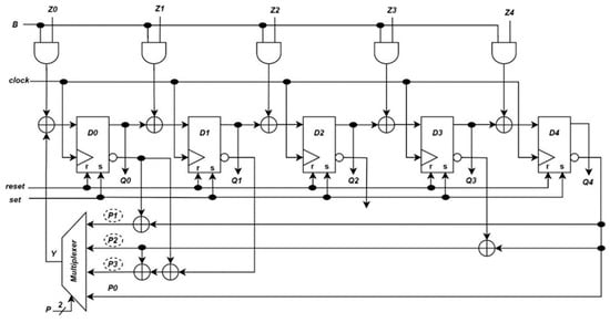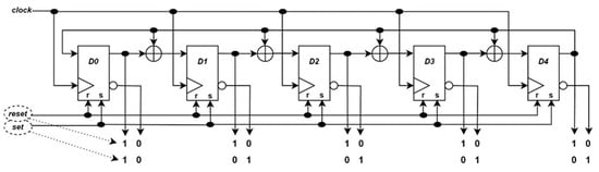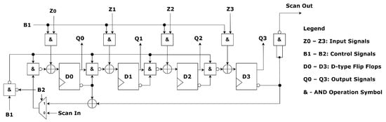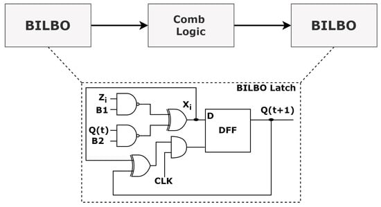 For each FF, one exclusive OR gate, one AND gate, and one NOR gate are added [78]. For each BILBO, one multiplexer, one inverter, and one or more exclusive OR gates (needed to construct a primitive characteristic polynomial) are added. As can be observed in Figure 7, the LFSR mode of operation uses an external feedback implementation for the characteristic polynomial expressed in Equation (5):