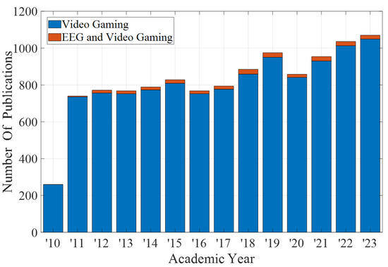 Human bio-signal sensing allowed relies on electrodes that can be wet or dry, and research is performed to propose other types of electrodes aiming to improve the quality of measures and ease of use [4,5,6]. In this field, Electroencephalography (EEG), a non-invasive method that records electrical activity of the brain, has emerged as a vital tool in understanding the cognitive impact of video gaming [7]. EEG’s ability to provide real-time brain activity data makes it particularly suitable for studying the dynamic cognitive processes involved in gaming. The intersection of EEG and video gaming research offers exciting opportunities for deeper insights into cognitive responses during gaming. This includes understanding how gaming can influence cognitive skills like attention, memory, and problem-solving, and investigating the neural correlates of gaming-induced cognitive changes [8,9]. The trends in scholarly publications on video gaming and EEG are determined through a comparative analysis of Scopus-indexed conference and journal publications, as shown in Figure 1. The base layer of the graph represents the total number of publications on the topic of Video Gaming. Superimposed on this, in a contrasting color, is the stacked count of publications specifically focused on EEG and Video Gaming [10,11]. This visualization highlights the growth and research interest in both fields, with a particular emphasis on the intersection of EEG technology and video gaming studies.