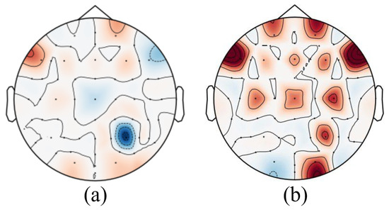Comparative brain heatmaps: (a) normal brain activity, (b) brain activity under stress with active frontal lobe. The generated heatmaps were calculated from the time domain root mean square (RMS) value of the EEG signal over a 1 s window.
