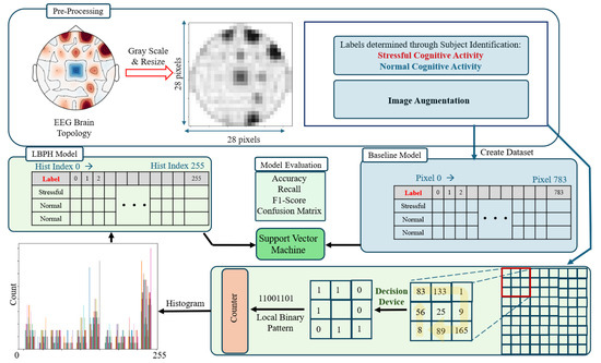 In contrast to the baseline model, a more advanced approach involves extracting features from the brain heatmaps using the Local Binary Pattern (LBP) technique, as depicted in Figure 7. LBP is efficient for summarizing texture information in images, including EEG heatmaps and has been used in EEG classification in different applications [36,37]. The method involves dividing each heatmap into regions and computing the LBP for each pixel, creating a binary code that captures the relative intensities in a local area. These binary patterns are then aggregated into histograms, each serving as a distinct signature of the activity in a specific brain region. The LBP histograms, with their reduced dimensionality yet rich information content, serve as input fora SVM model designed to classify different states of brain activity.
