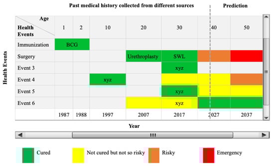 - Health events: In the SHGC, health events are defined as “the summary of specific occurrences related to health complexities, preventive measures, and treatment actions”. These health events are visualized by tracking age and year to understand when, and at what age, specific health issues occurred. Furthermore, future health events can be visualized by analyzing past medical history.