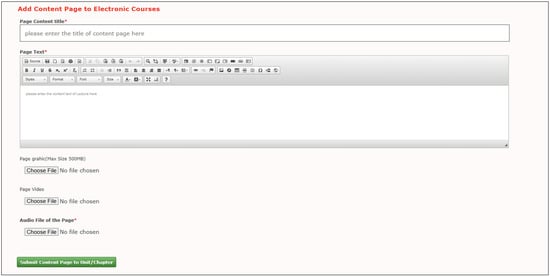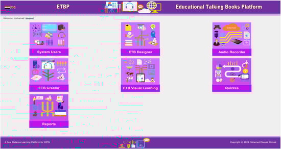 Some recent research concentrated on creating customized learning platforms for teaching particular subjects and student groups, such as [30] who presented a specialized learning platform for teaching biology to secondary school students. Moreover, [31] offered a specialized web-learning platform in the medical domain for undergraduate medical students. Additionally, [32] introduced a specialized web-learning platform for supporting gifted children’s education. Also, [33] presented a new distance-learning platform for creating and delivering learning content for deaf students with sign language translation videos. A web-based platform was also provided by [34] to support the learning process of visually impaired children. Other recent studies [9,10,11,12,13,15,16,17] focused on positive learning aspects with audiobooks or digital talking books for learners and did not focus on developing a specialized learning platform for designing and creating online ETBs. Compared with this literature, the primary distinction of our proposed platform is the presence of a web-based platform that supports instructors’ teaching skills in designing and producing online ETBs for instructional and information technology students. The proposed platform considers an ICT teaching aid that consists of several tools developed specifically for educating students in instructional and information technology departments and can be used by any instructor. Since the suggested platform design was general, the tool’s development was concentrated on supporting all educational book domains. For target students, these tools, which include ETB designer, ETB creator, ETB visual learning, and quizzes, help students boost their skills. For the coming improvement, the user interface of the current version of ETBP will be redesigned to become more satisfying and artistic in the future. The redesigned version will include an attractive user interface, a hyperlink for the ETBP title to move to the main interface easily from any page, a text hint for each tool, and a rename of the dashboard to the main page. The quiz tool will be redesigned in the future to be more satisfactory for users. The redesigned version will include instructions for creating quizzes and questions and new question types, like fill-in-the-blank and write-an-essay.