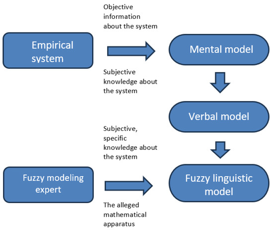 Fuzzy modelling is based on expert knowledge. It may be subconscious, so it is difficult to obtain directly. The most common way to obtain it is to observe the work and reactions of an expert when handling a process. Conscious knowledge can be captured directly and formulated into an explicit record. The expert’s knowledge about the process is called the mental model [33]. A diagram illustrating the process of creating a fuzzy linguistic model of a real system is shown in Figure 1.