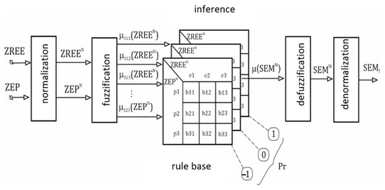 The fuzzy model consists of a series of blocks. The first one is Normalization. In this block, the input quantities ZEP and ZREE are converted into their normalized forms ZEPN and ZREEN in the range [−1, 1]. In the model, the normalized modal values of the sets of fuzzy inputs, with the values given in Section 2.1 and qualitatively marked in the survey and Table 1, Table 2 and Table 3 as M, S, and D, define the location, i.e., the values uSN, uPN, and uLN—Formula (1). They are necessary to determine the value of the function belonging to fuzzy sets of current values at the model input.