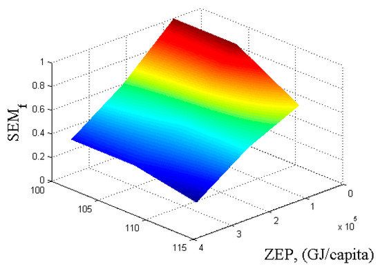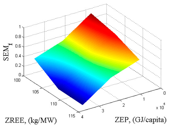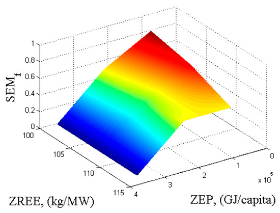 It should be noted that in the case of unfavorable legal conditions in the environment, the SEMf indicator has a maximum value of 80% and a minimum value of 0% (Figure 3). Energy security is at risk when the demand for primary energy is high, regardless of changes in the level of demand for REEs. The maximum value is achieved with minimum REEs and primary energy demand. Energy security will therefore be at risk in the event of a high demand for energy, which the state will not be able to cover with the energy carriers available in the energy mix. The course of the function parallel to the REEs axis indicates that this phenomenon will be independent of the share of RESs in the mix. This situation may occur if coal is withdrawn from the energy mix.