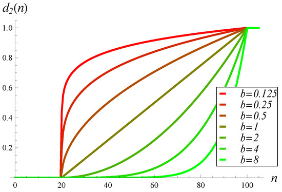 Specifically, depends on a parameter . A higher value of b makes less aggressive, meaning the dropping probability is lower across the entire operating range from 20 to 80, and vice versa. For , the function is linear, for , it is convex; and for , it is concave. Several selected shapes of are illustrated in Figure 1.