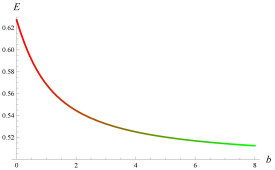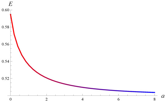 In Figure 6, the energy efficiency versus a is shown. As expected, the energy efficiency decreases with a because a smaller a prolongs the energy-saving phase, thereby increasing E. Similar to the previous section, a can be utilized to achieve a desired energy efficiency. For , we have , while for , we have . Hence, any value of E within the range can be obtained in this manner. For example, is achieved when .