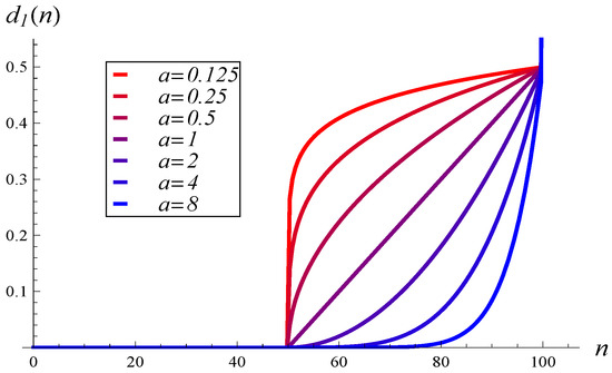 where a is a non-negative parameter. Generally speaking, (50) is of the same type as (49), but it operates over a narrower range of queue sizes, 50–100, and is limited to 0.5, to prevent the energy-saving phase from growing indefinitely. A few shapes of are depicted in Figure 4.