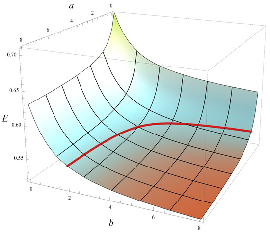 Figure 7 depicts the system’s energy efficiency versus parameters a and b. The achievable range of energy efficiency is now significantly wider, from , achieved with , up to , achieved with . For example, to set , there are now many possible combinations of a and b that satisfy this requirement. The red line in Figure 7 illustrates such combinations of a and b.