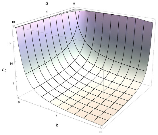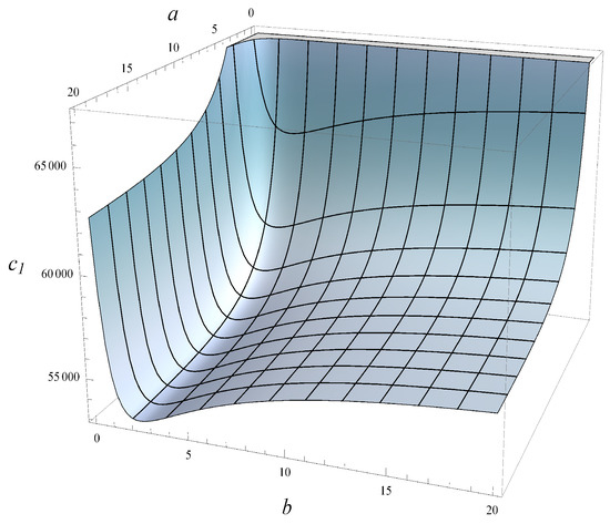 In Figure 10, the cost (52) versus a and b is shown. The optimal setting is, therefore, , i.e., .