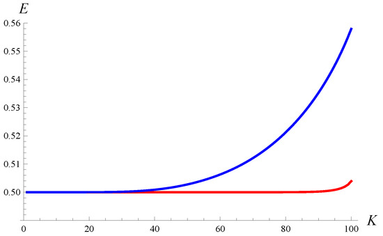 Energy efficiency vs. threshold K in two situations: when passive management is applied in both phases (red curve) and when active management is applied in both phases (blue curve).