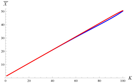 In all numerical calculations, we will assume the arrival rate and hyperexponentially distributed transmission time, with parameters and . This gives an average packet transmission time of . Therefore, the service rate is twice the arrival rate during the transmission phase. The standard deviation of transmission time is 0.448, resulting in a coefficient of variation of 1.79. This indicates significant variability in the transmission time (i.e., packet size). Moreover, in all calculations, the buffer capacity is . Unless specified otherwise, the critical threshold is . The value of K will only be altered when this section ends, where we research the influence of K on the system’s performance.