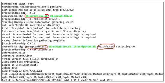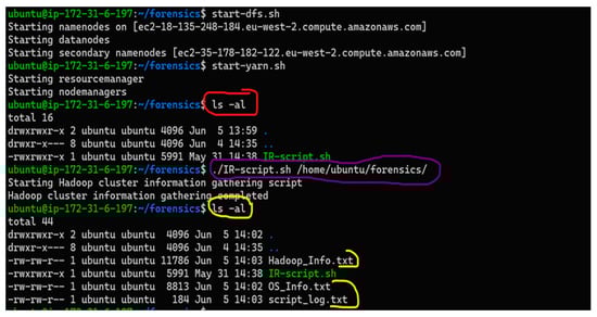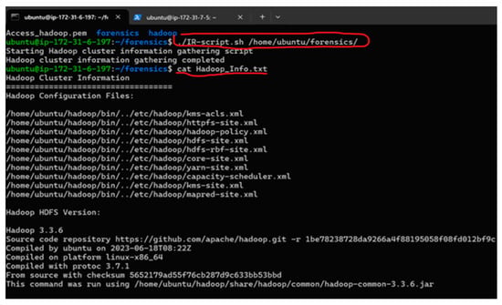 Furthermore, a novel incident response script (IR-script) was developed utilising the powerful scripting capabilities of the Linux Bash shell, standard Linux commands, and Hadoop commands relevant to DFR. Linux scripts help automate tasks, manage system operations, and facilitate various administrative activities. The IR-script provides a comprehensive solution for first responders conducting investigations within Linux–Hadoop cluster environments. By integrating automation to extract supporting evidential information, the script enables investigators to efficiently gather crucial preliminary artefacts necessary for thorough forensic analysis. Upon execution, the script systematically probes the Linux–Hadoop cluster, extracting supporting evidence from both the underlying Linux operating system and the Hadoop cluster. This information is particularly valuable for investigators at the initial and concluding stages of their investigations []. Its user-friendly design caters to both seasoned investigators and those with limited knowledge of Linux and Hadoop cluster environments, ensuring accessibility and usability in diverse investigative scenarios.