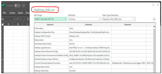 Functionality in this context refers to the ability of the script to perform its intended tasks accurately and efficiently. Functionality evaluation was conducted to ensure that the script successfully collected and organised the necessary supporting forensics artefacts. A key objective was to evaluate the script’s effectiveness across various Linux–Hadoop configurations, focusing on its ability to collect detailed OS and Hadoop-specific information in both TXT and CSV formats. Figure 5 below shows a partial screenshot of the importation of the Hadoop_Info.csv file generated from the Oracle VB testbed into Microsoft Excel.