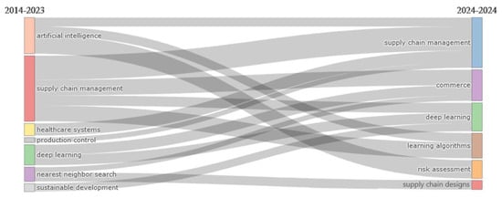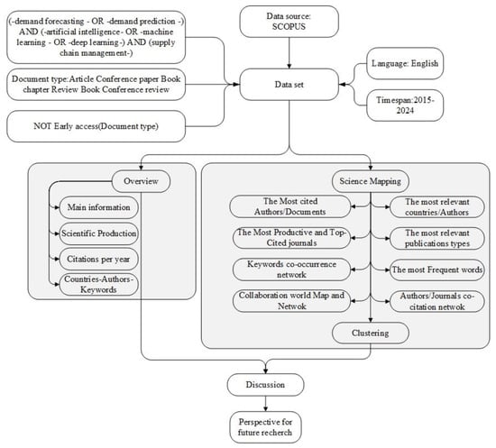 Table 1 describes the search methodology employed for conducting a literature review. The present search created a corpus of document sets of papers compatible with the search strategy’s criteria of the document’s titles, abstract, or list of keywords. The existing research on the application of artificial intelligence and machine learning specifically within supply chain management for forecasting demand is vast. The application has increased since 2010, resulting in several successful examples and controversies for future employment and business management [21,22]. Nowadays, various corporations employing AI invest heavily in this technology to optimize their supply chain’s full operation scope [23], further leading to redirecting academic attention to update their core research to modern AI. On such a note, the exploration of academic directions with focus on AI for supply chain demand forecasting commences and becomes regular. Applying this selection, the literature review was limited to 2014–2024. Under these conditions and criteria, the research garnered in this project reached a total of 119 articles within recent research until 13 August 2024.