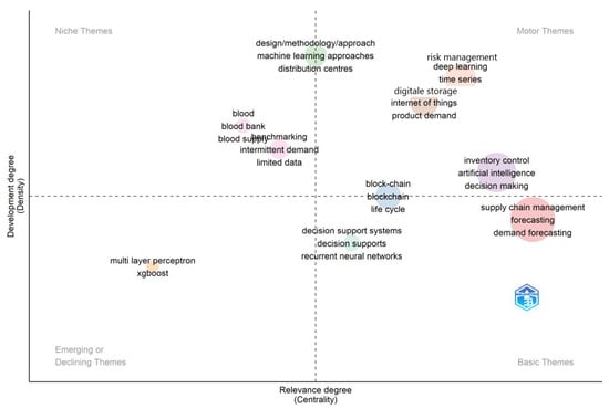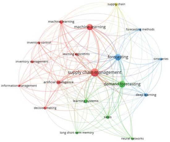 This research focused on “supply chain management” and “demand forecasting”, using SCOPUS as the primary source database; consequently, 119 representative articles were selected. Using VOSviewer, a bibliometric analysis tool, keywords that appeared at least ten times were identified, and a keyword co-occurrence network diagram was constructed. The network diagram highlights frequently mentioned phrases, such as “supply chain management”, “machine learning”, “forecasting”, “artificial intelligence”, and “deep learning”. These phrases summarize the content of the articles and illustrate the composition of research within this field.
