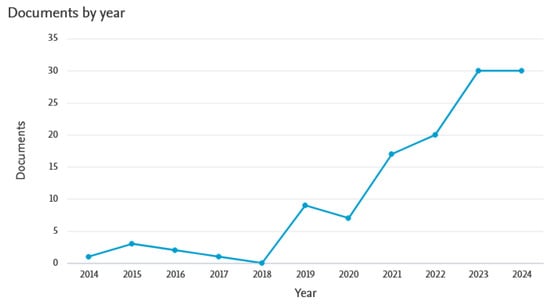 In the broader context, it is important to monitor the progress in the overall number of publications over time. From the analysis of Figure 4, we can identify several phases in the development of research output. In the emerging phase (2014–2017), very few articles were published each year—specifically, not more than 1 to 3 publications per year. The year 2018 saw no publications at all, indicating an early stage of limited interest or exploration in this field. This phase suggests either a lack of interest or merely tentative engagement with the topic.