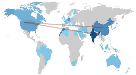 As depicted in Figure 7, the distribution of publications by the countries of the authors and their contributions to the field provides insightful perspectives on the global nature of this research area and its interconnections with other fields. The collaboration network covers a wide range of countries from various continents, such as Asia, Europe, North America, and Africa. This broad range indicates diverse interests in the research topic, originating not only from developed countries but also from underdeveloped ones. The involvement of countries like China, the USA, Germany, and India suggests that the scope of the research area is not confined to a single region but represents a cumulative scientific endeavor of worldwide concern.