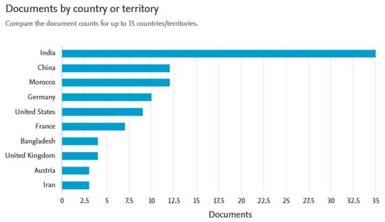 In this context, the distribution of scientific works across numerous nations, as shown in Figure 8, provides a clear picture of the global research landscape. India stands out as the leading contributor, with 35 publications. This demonstrates not only a strong presence in academic circles but also indicates that significant importance is placed on this research area in India. This prominence can be attributed to substantial funding driven by evolving academic and industrial interests in the country.