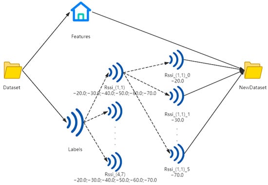 To enhance the model’s ability to learn the relationship between feature parameters and each RSSI value, we segment the fingerprints after data loading, ensuring that each RSSI value occupies a separate column. This allows the model to better capture the RSSI values from each access point (AP) across different environments during the training process. By doing so, the model can more accurately learn the relationship between RSSI values and environmental features, thereby improving both learning efficiency and accuracy. After segmentation, the data is merged with the original features, as illustrated in Figure 2.