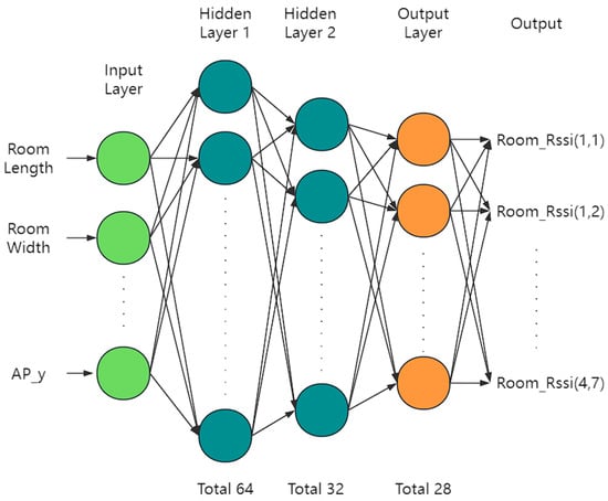 Here, represents the path loss index (which reflects the signal attenuation due to environmental factors) and accounts for additional losses caused by walls and other obstacles. This means that features such as wall thickness, material, and distance directly influence the value of D, thereby affecting the RSSI value. When the model is used to predict a user’s location, it is essential to consider the impact of these environmental features on the RSSI values. The model must learn how these factors alter the RSSI signal to enhance the accuracy of its predictions.