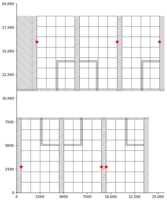 The gray areas represent walls, and the asterisk indicates the location of the AP (access point). There is also a bathroom in the house, with its wall acting as the main barrier to signal propagation. In this paper, a coordinate system is established with the lower-left corner as the origin, and the coordinate axes denote actual distances in millimeters. This setup allows for a clear and detailed representation of the parameters and coordinates of each part of the room.