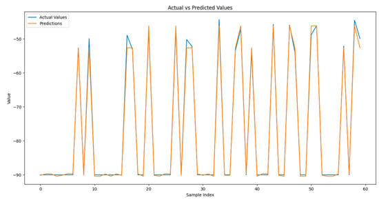 The comparison between the actual and predicted values from the training results is illustrated in Figure 5. The graph reveals a close alignment between the predicted value curve (orange) and the actual value curve (blue), with only minor deviations at certain peak points. This close overlap suggests that the model accurately captures the data trends and effectively approximates the true output values. The high degree of agreement between the curves indicates that the model possesses strong predictive ability and high reliability.