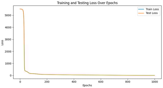 The specific loss values per hundred cycles for the training and test sets are depicted in Figure 6, illustrating how the model’s loss changes throughout the training process. The figure shows a rapid decline in loss values during the initial stages of training, followed by a gradual leveling off. This pattern suggests that the model quickly learns key patterns and features in the data within the first few cycles, resulting in a significant reduction in loss. Over time, the model continues to optimize, and the decreasing trend of the training loss eventually stabilizes, indicating good convergence.