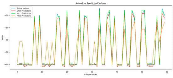 These deviations highlight a significant deficiency in the model’s predictive ability. The RNN model fails to accurately reflect the changes in the actual values, indicating that it did not fully learn the underlying characteristics of the data when handling this dataset, leading to considerable prediction errors.