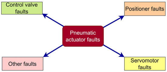 Pneumatic actuators are extensively employed in a wide range of industrial applications because they are easy to operate, dependable, and efficient at controlling valves and other mechanical devices. The pneumatic actuator comprises three major subparts as follows: a control valve, a pneumatic servomotor, and a positioner. However, abnormalities may strongly influence the operation of the process loop, thus affecting the end product. The faults associated with pneumatic actuators are categorized into four groups [20], as represented in Figure 1. Among these groups, three are based on the source of abnormalities in parts, such as control valve faults, pneumatic servomotor faults, and positioner faults. The fourth group is general faults, which include faults that are not specific to one particular component.