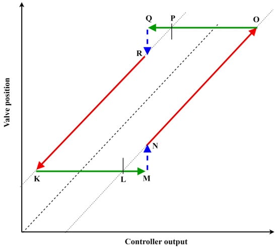 The main cause of static friction or stiction is opposition to the movement of the valve stem. Thus, valve movement is achieved when the pressure applied on the valve to cause movement in the valve stem must overcome the opposing forces obstructing valve movement. When the applied force surpasses the static friction force, a sudden movement in the valve stem can be observed, which is due to the dynamic friction force based on the velocity of the stem movement. Then, because of the velocity, the valve becomes stuck in the new position. The controller starts reducing the input when the actual valve position is more than the required position. Thus, such repeated movements cause stick and slip movements in the valve, representing stiction in the control valve. The stiction behavior of the valve is represented by the following three regions: constant, jump, and movement or motion [34], as shown in Figure 2. The constant is the region where there is a change in controller output, whereas no change is observed in the actual valve position or manipulating variable, represented as region ‘KLM’, where ‘KL’ represents the deadband, whereas ‘LM’ represents the stick band. The jump is the region where a sudden change in the valve stem movement is observed, depicted as ‘MN’. Movement or motion is the third region, where the actual valve keeps moving with a very slight variation in the control input, represented as ‘NO’. This behavior is observed when the controller input continuously increases, and stick jump operations are also observed when the controller output is reduced, as represented by ‘OPQK’. In Figure 2, the green line represents the constant region, the movement of the valve is represented by the red line, and the jump phases are represented by the blue dashed line.