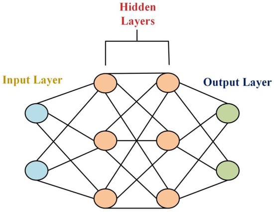 A typical neural network consists of multiple hidden layers with multiple neurons, as shown in Figure 3. The larger the neural network is, the greater the computational cost and time, with or without a significant increase in performance due to phenomena such as overfitting. A neural network learns by adjusting its weights, which is performed by calculating the cost function. The cost function is the difference between the actual and predicted values. The fundamental goal of training a neural network is to minimize this cost function. Based on this calculated cost function, the weights are adjusted. This process of adjusting the weights based on the cost function is called backpropagation.