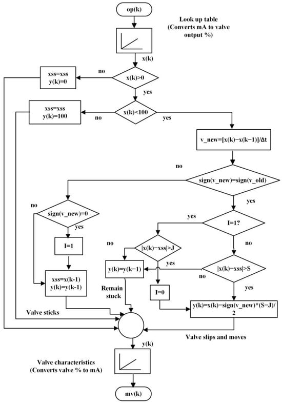 Figure 5 shows the flowchart of the process of generating stiction data. The stiction block input is the control signal at 4–20 mA, and the output is the control valve movement in terms of the percentage of full-scale movement. For increasing control input, the sign function gives a positive output, whereas it gives a negative output for a decreasing control signal. The sign function returns a ‘0’ when there is no change in the control signal from its previous value; thus, the valve is stuck. If a sign change from positive to negative is observed in the control signal, it represents the start of the stick phase, and the corresponding valve position is considered to be ‘xss’. On observing the change in the sign of the slope, the valve slips and starts moving if the total change in input beats the stick band and/or deadband. This stick–slip action may repeat in the same direction, thus indicating that ‘I’ is ‘1’ for the stick phase and ‘0’ for the jump phase.