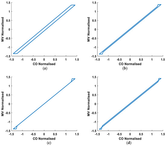 Using the Choudhury model, open loop data were generated for stiction behavior for various combinations of ‘S’ and ‘J’ values [55]. The responses shown in Figure 6 are from an open-loop system where the input is a sine wave with an amplitude of 50 and a frequency of 0.02 π rad/s. The responses obtained were normalized before plotting the controller output versus the valve stem movement. The output was calculated using the following equation: